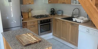 The kitchen comes equipped with stove, fridge-freezer, dish washer, and coffee machine.